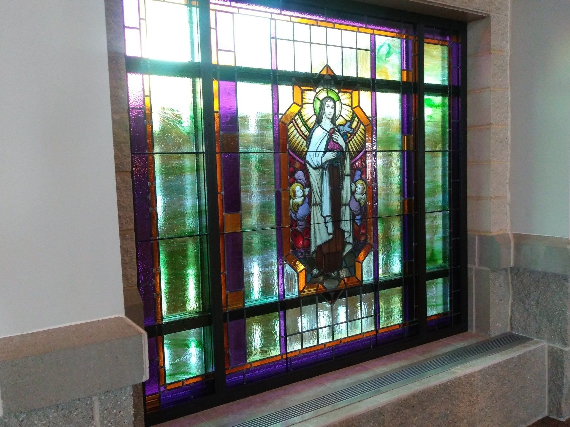 From removal of original window from former church, to new concept, complete rebuild and modification of the stained glass panel, to installation of the modified window and new additional panels on the sides. These are a few pictures for many churches we have restored the stained glass around the Wisconsin area.